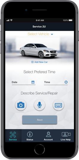 The user is shown what vehicle they have stored within the app or can utilize the ‘add new car” feature to add or change the selected vehicle . They can also, setup a service, select the preferred Date and Time and describe the problem with their vehicle by using one of the three inputs.