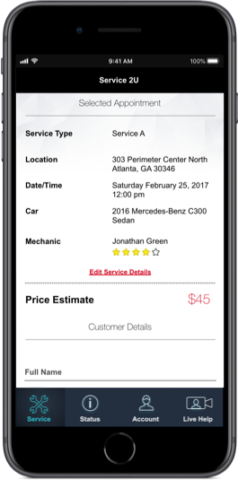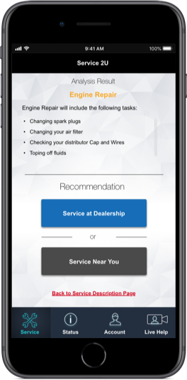 The app will analyze the input and recommend the appropriate service. The user will have the option to have a tech come to them or to send their car to a dealership.