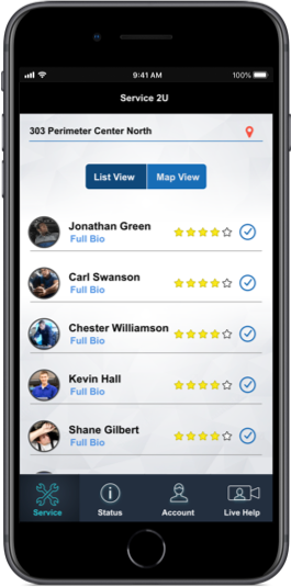 If the user elects to have their vehicle serviced near them, they will be given a list of available technicians nearby. They can view the technicians sorted either by rating or by proximity to their location.