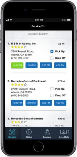 If the user selects to have their vehicle picked up and serviced at a dealership, a list of available dealers and appointment times would be displayed. The user selects their preferred appointment time and are given the option to have their car picked up at their current location.